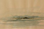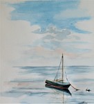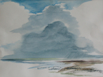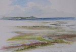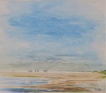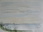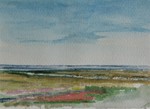 Vlie wad mooie lucht boven wad met zeekraal en lamsoor op grof papier.