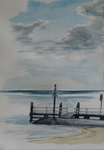 Vlieland met mooie lucht, oud houten baken en uitzicht op aankomststeiger.(45)
