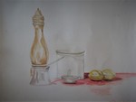 Stilleven met glazen potten, peperbus en fruit.