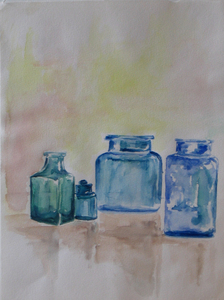 Stilleven met mooie blauwe glazen potten.