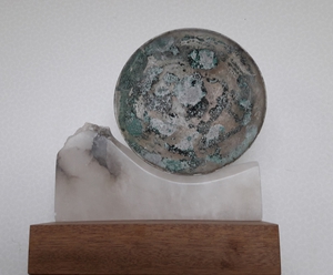 witte albast met bewerkt metaal op houten sokkel